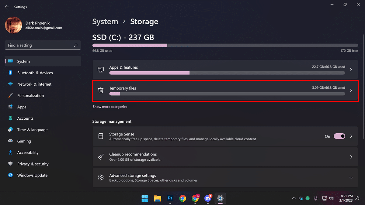 - bajo elAplicaciones y característicasopción, haga clic enArchivos temporalesopción.