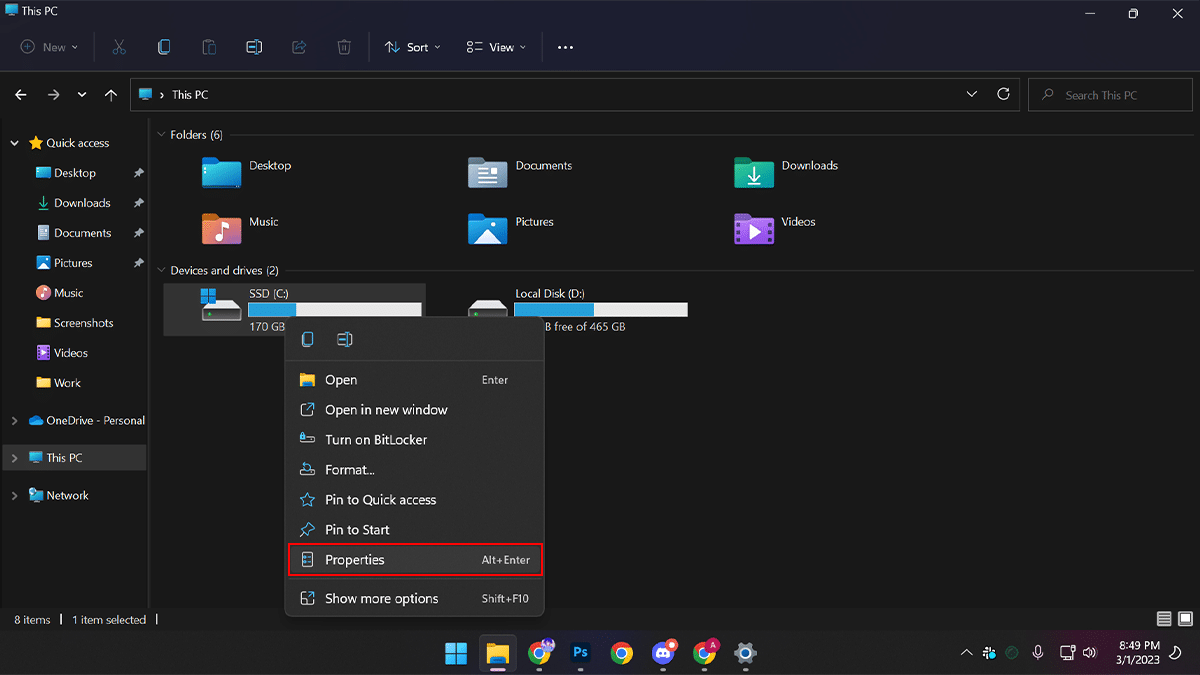 - AbiertoExplorador de archivos> haga clic enEsta computadora> bajo elDispositivos y unidades> haga clic derecho en la unidad con la instalación de Windows 11 (generalmente launidad C) > haga clic en elPropiedadesopción.