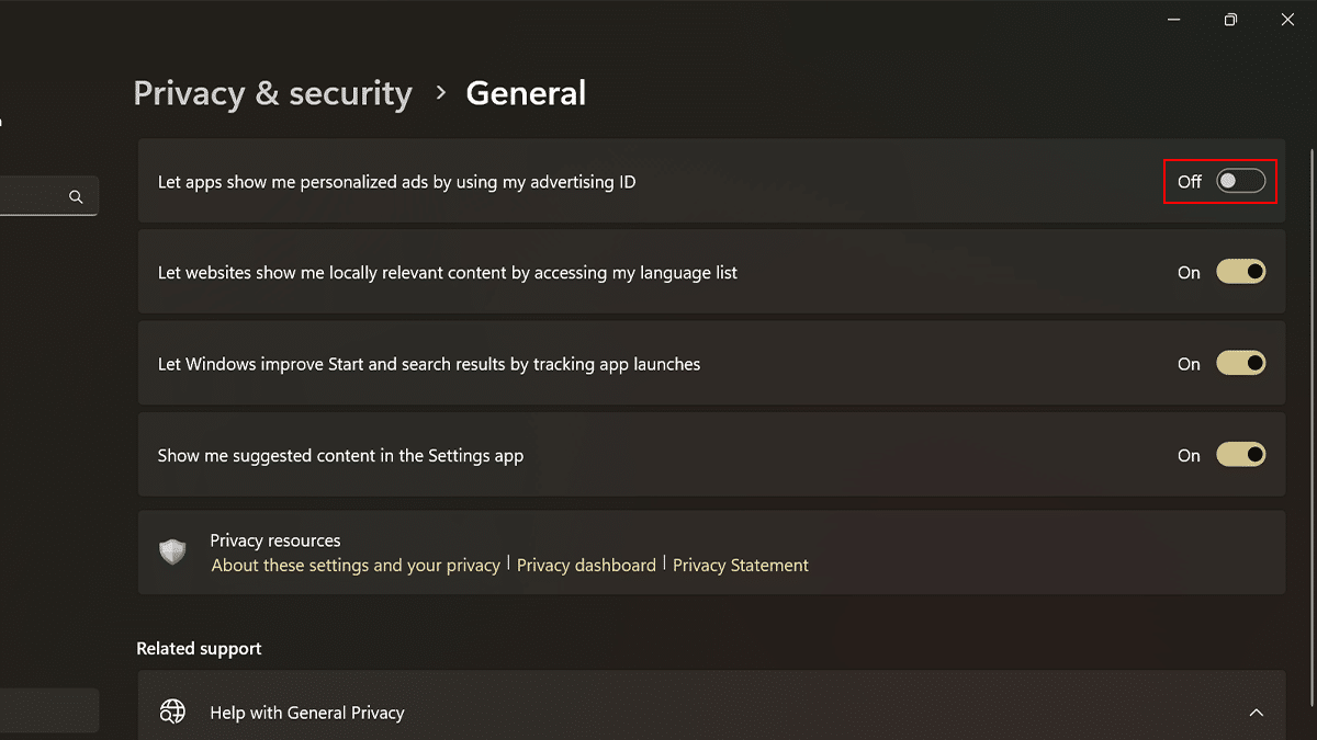 En algunos escenarios, los anuncios personalizados pueden ser útiles para encontrar productos y servicios que puedan interesarle. Pero si prefiere no ver anuncios según su comportamiento, Windows 11 le permite desactivar el ID de seguimiento. Aunque es posible que veas anuncios en las diferentes aplicaciones, no estarán personalizados.
