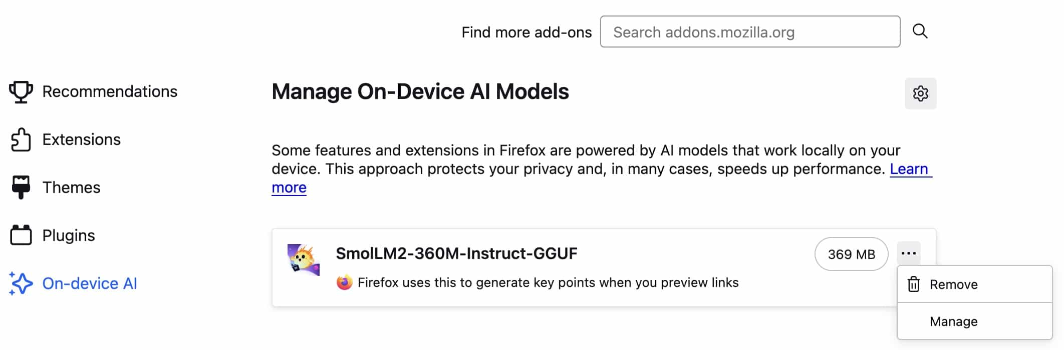 También puedes eliminar cualquier modelo de IA que Firefox haya almacenado localmente: