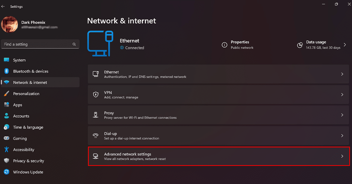 - Hacer clic enRed e Internety haga clic enConfiguración de red avanzada.
