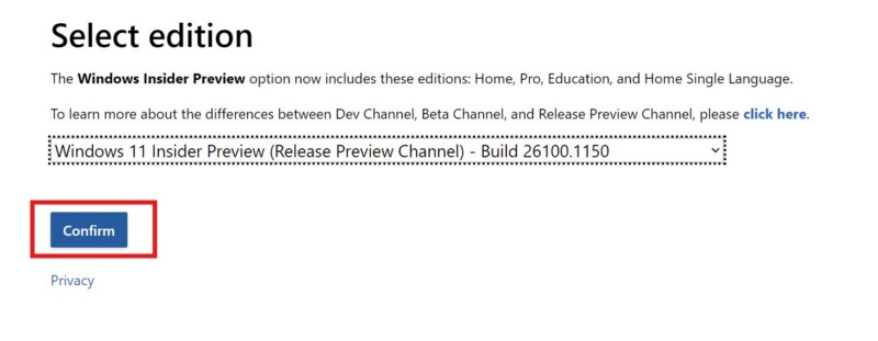 4.Ahora, elige elVista previa interna de Windows 11 (canal de vista previa de lanzamiento) – Compilación 26100.1150opción.