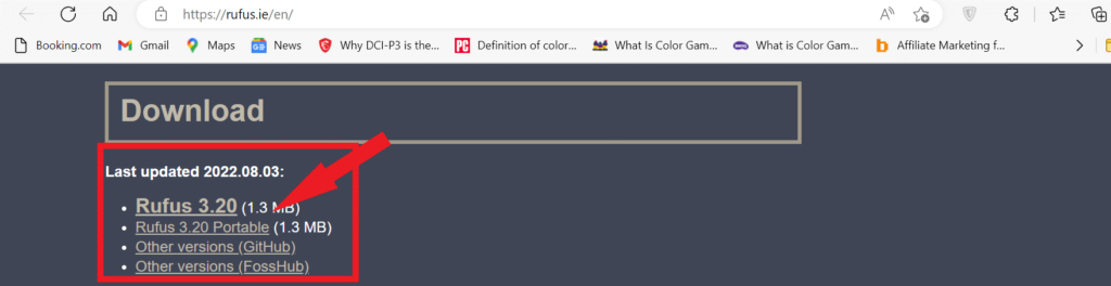 - Haga clic aquí para ir al sitio web oficial de Rufus. En la página, desplácese hacia abajo y descargue la última versión.