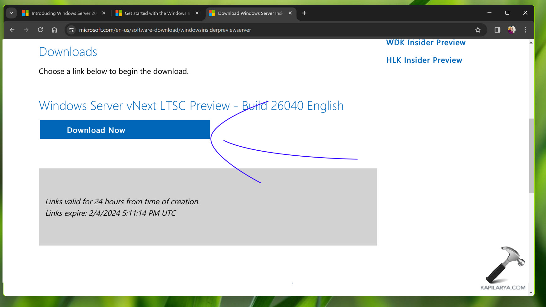4. Finalmente, se debería generar el enlace de descarga. Puede utilizar este enlace para descargar el archivo ISO de vista previa de Windows Server. Este enlace es válido durante 24 horas desde el momento de su creación. Puedes utilizar este enlace desde cualquier dispositivo, también desde cualquier navegador.
