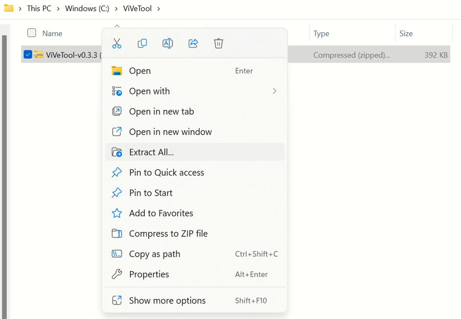 Paso 6:Extraiga el contenido de esta carpeta comprimida en la carpeta ViVeTool que hemos creado en la unidad C:.