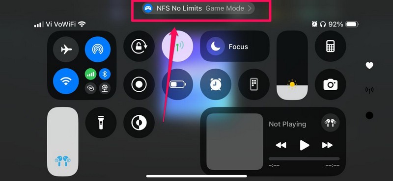 En la parte superior del Centro de control, encontrarás el nombre del título que estás reproduciendo actualmente en tu iPhone junto con elEtiqueta del modo de juegoal lado de él.