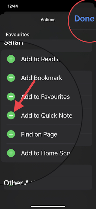 4.En Safari, toque el“+”botón que aparece a la izquierda de “Agregar a nota rápida“.