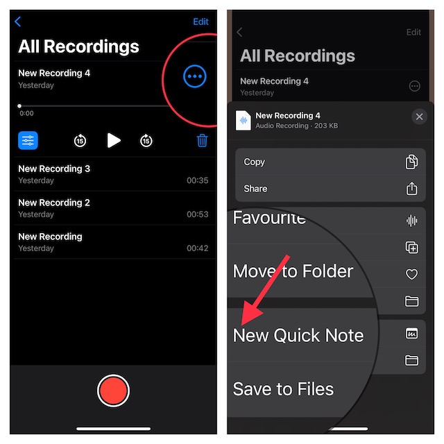 Si utiliza la aplicación Notas de voz, le alegrará saber que también existe una forma rápida de crear una nota directamente desde la aplicación. Puede resultar útil en varios contextos. Por ejemplo, cuando esté grabando un pensamiento o grabando el discurso de un orador y desee agregar una nota rápida a la grabación de audio, tendrá un papel que desempeñar.