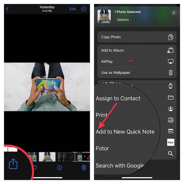 2.Toca elIcono de compartiry elige elAgregar a nueva nota rápidaopción en la hoja de compartir.