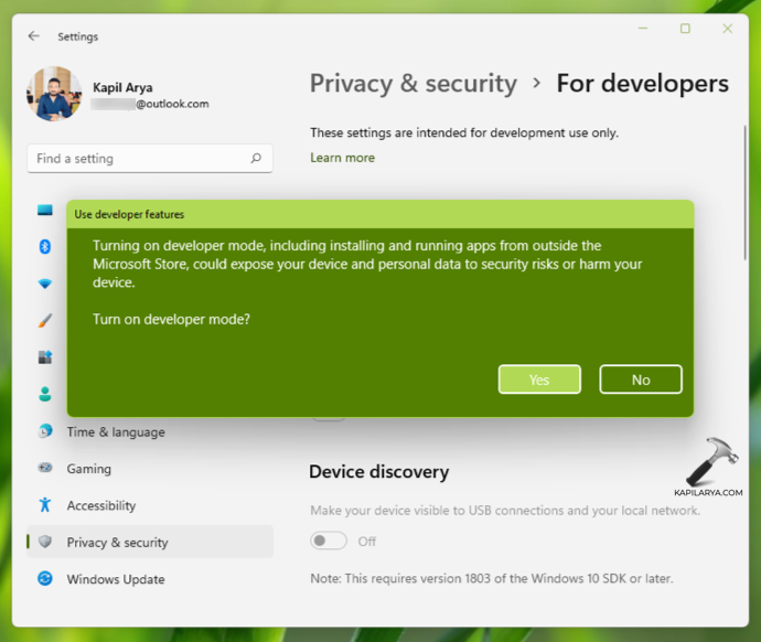 Finalmente, si presionó Sí arriba, el modo de desarrollador debería estar habilitado en su sistema Windows 11.