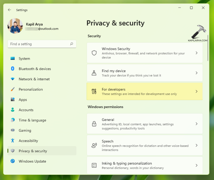 3.En el panel derecho correspondiente, en Seguridad, haga clic enPara desarrolladores.
