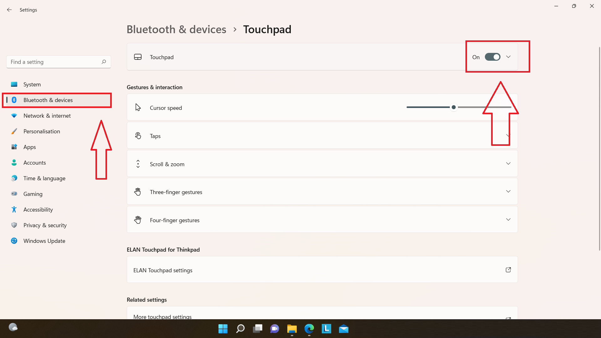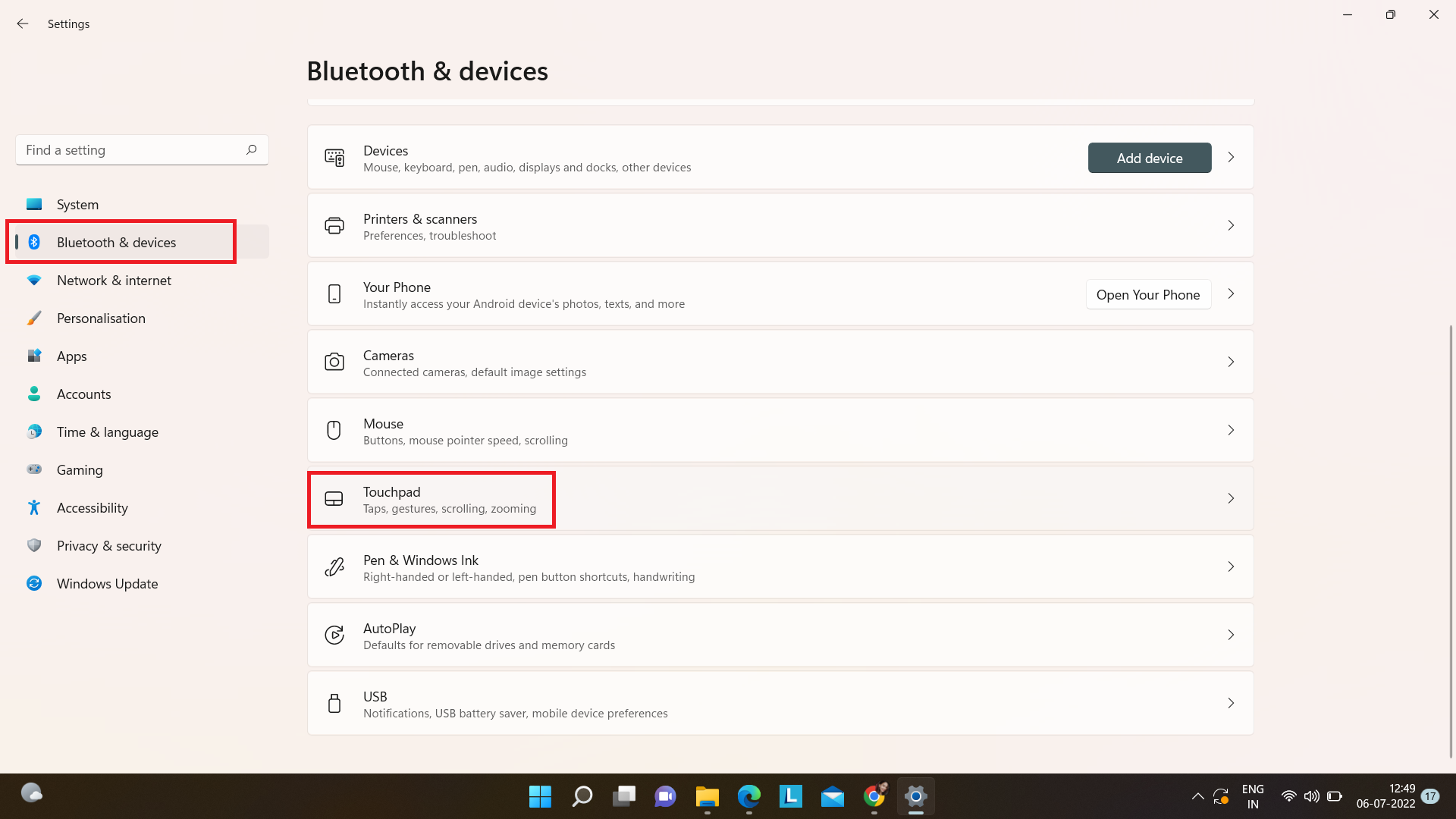 2.Hacer clic enBluetooth y dispositivosdesde la barra de menú izquierda, y luego enPanel táctil.