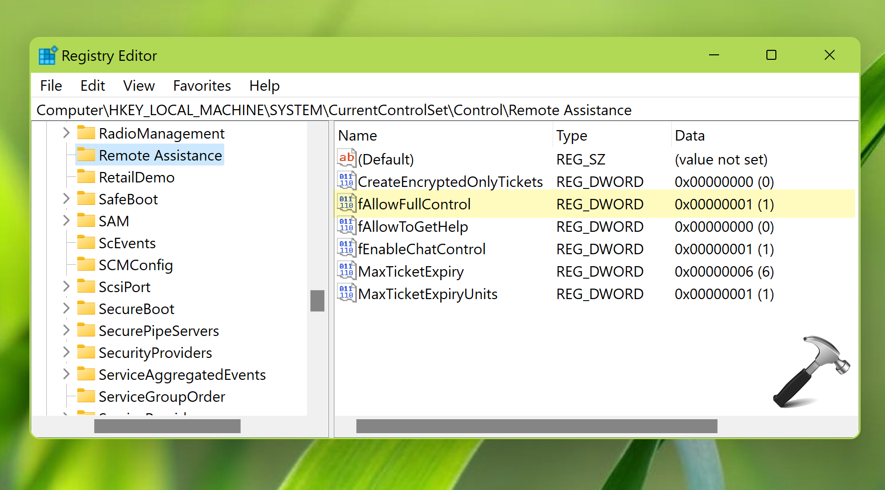 fAllowFullControlregistro DWORD (REG_DWORD). Establezca este DWORD en datos de 1 valor para permitir la asistencia remota.