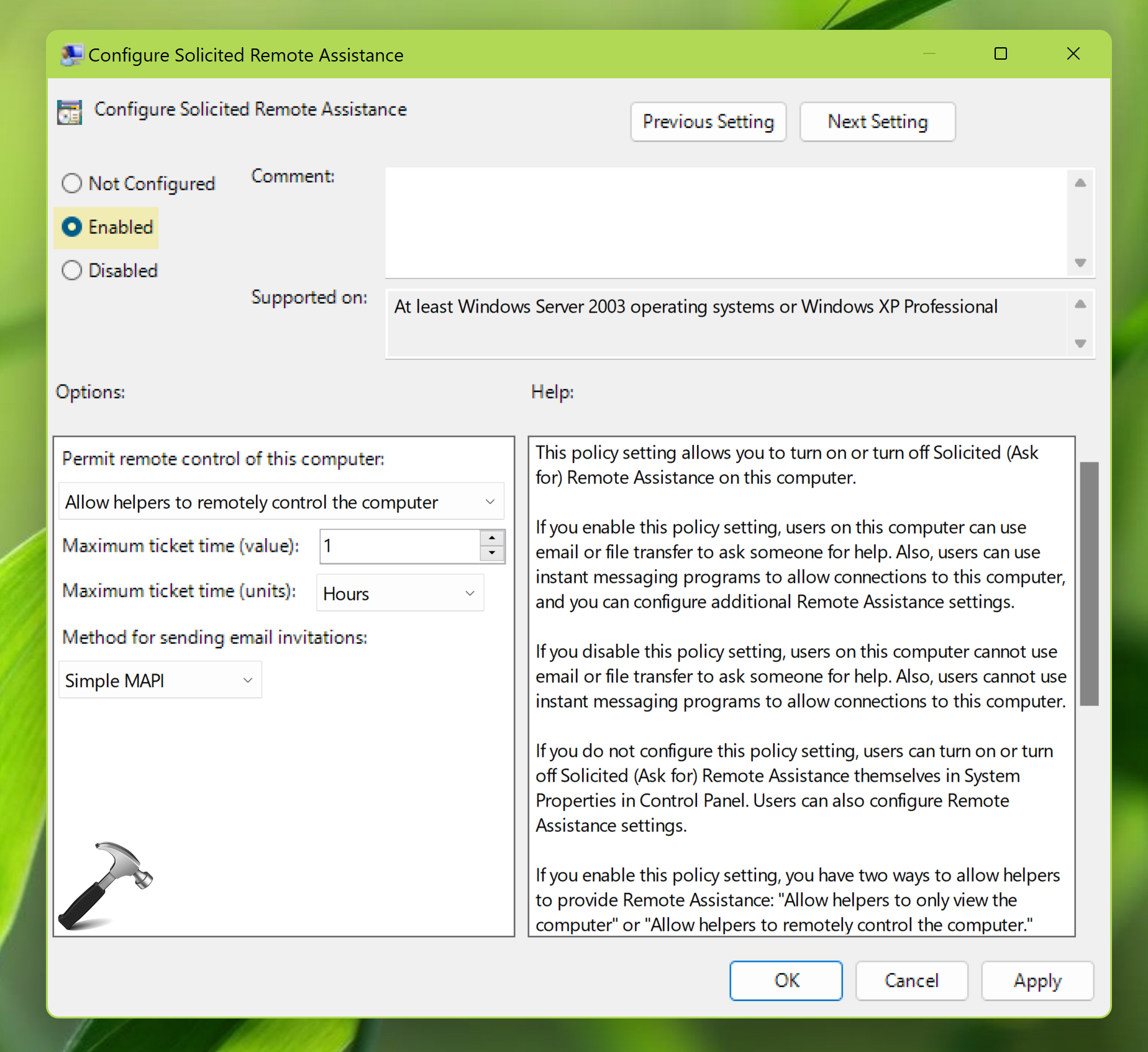 - En la ventana de configuración de la política, envíela aActivadopara permitir la asistencia remota. Haga clic en Aplicar seguido de Aceptar.