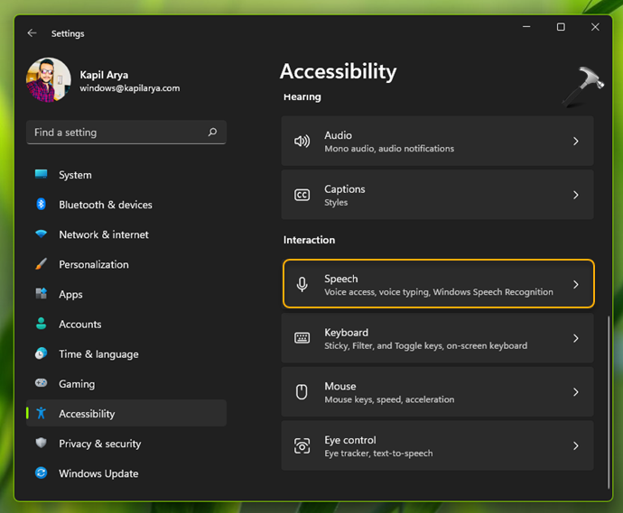 2.Ir aAccesibilidad. En el panel derecho, haga clic enDiscurso.
