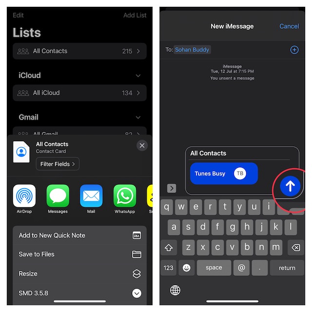 5.Finalmente, aparecerá la hoja para compartir estándar que le permitirá exportar sus contactos de iPhone a través del medio preferido como WhatsApp, Mensajes, Correo y más. Seleccione la aplicación deseada y comparta los contactos.
