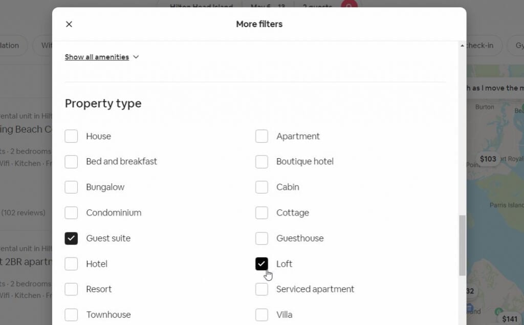 Estas selecciones te permiten aislar los listados de Airbnb para mostrarte solo cosas como una casa entera, un bed and breakfast, una cabaña y más.