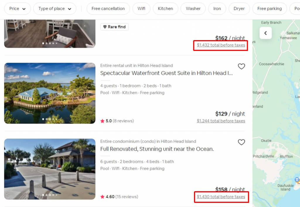 Puede notar que algunas estadías en Airpnp pueden tener estadías por noche equivalentes o más económicas que otras, pero el total antes de impuestos es aproximadamente igual o mayor.