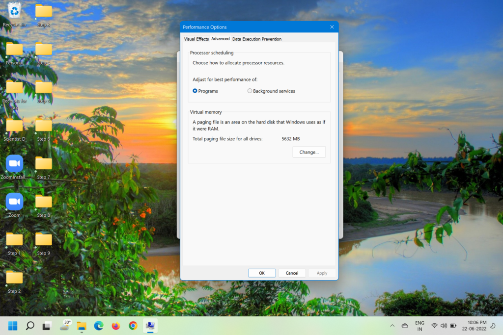 5.Ahora, pase nuevamente a laPestaña Avanzada en Opciones de rendimientoventana y haga clic enCambiarbajoMemoria virtual.