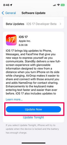 5.Una vez que aparezca la última actualización de iOS 17 en la pantalla, toque elActualizar ahorabotón para iniciar el proceso. También puedes tocar elActualizar esta nochepara continuar el proceso a una hora específica de la noche cuando su dispositivo se esté cargando.