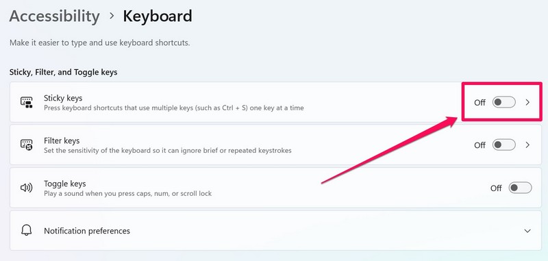 Ahora, otra causa común por la que el acceso directo Alt + F4 no funciona en Windows 11 es la función de teclas adhesivas. Sticky Keys es una función de accesibilidad en Windows que mantiene una tecla registrada durante unos momentos después de presionarla y soltarla. Esto es para permitir a los usuarios con capacidades diferentes utilizar fácilmente atajos de teclado en sus PC y portátiles que implican presionar y mantener presionadas varias teclas a la vez.
