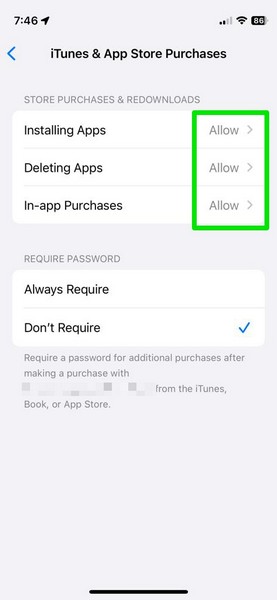 6.Ahora, asegúrese de que las opciones paraInstalación de aplicaciones,Eliminar aplicaciones, yCompras dentro de la aplicaciónsonestablecido en Permitiren tu dispositivo.