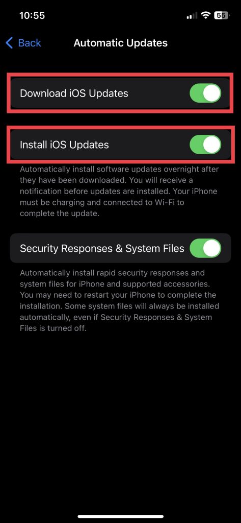 5.Y encienda los interruptores paraDescargar actualizaciones de iOSyInstalar actualizaciones de iOS.