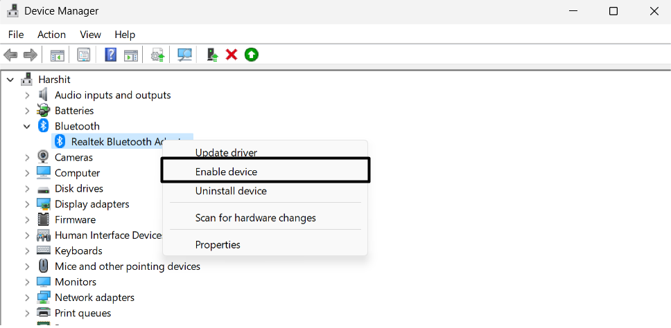 4.Seleccione elHabilitar dispositivoopción del mismo menú para encender nuevamente el dispositivo en su PC.