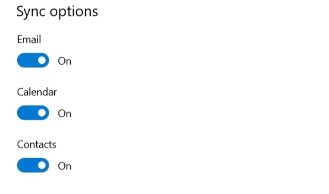 6.Por último, habilite elCorreo electrónico,Calendario, yContactosalterna y haga clicHechopara guardar la configuración.