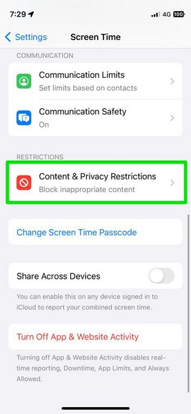 3.Desplácese hacia abajo para localizar elRestricciones de contenido y privacidadopción ytócalo para abriren tu dispositivo.