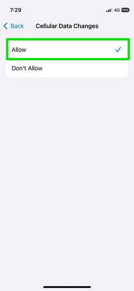 Sin embargo, vale la pena señalar que incluso si dicha configuración no está permitida en el tiempo de pantalla, podrá habilitar o deshabilitar los datos móviles a través de la configuración celular en la aplicación Configuración de su iPhone. Dicho esto, puede seguir los pasos a continuación para permitir la opción Cambios de datos móviles en Tiempo de pantalla en su dispositivo: