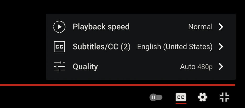 Intente reducir la calidad del video manualmente. Seleccione la forma de dienteAjustesen la esquina inferior izquierda del panel o pantalla del reproductor multimedia mientras está en modo de pantalla completa. Luego, señala aCalidady seleccione una resolución sub-HD (360p o 480p).