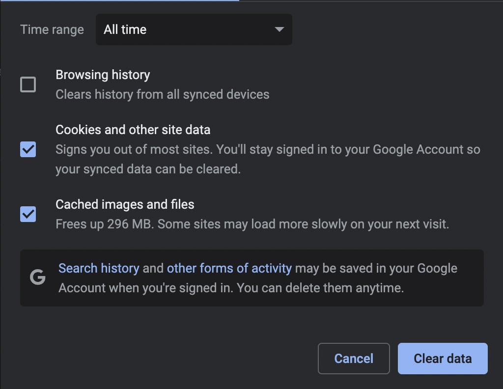 Nuevamente, tomando Chrome como ejemplo, escribachrome://configuración/clearBrowserDataen una nueva pestaña y presioneIngresar. Luego, establezca elRango de tiempoaTodo el tiempo, elige elCookies y otros datos del sitioyImágenes y archivos almacenados en cachécategorías y seleccioneBorrar datos.