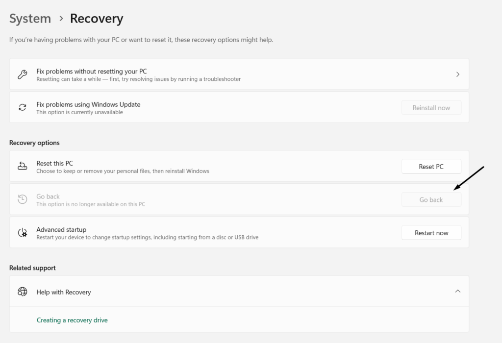 Para algunos usuarios, el problema apareció justo después de actualizar la PC con Windows 10 a Windows 11. Antes de eso, DaVinci Resolve funcionaba completamente bien. Si te pasa lo mismo te sugerimosrevierta su PC con Windows 11 a Windows 10. Así que consulte los pasos que se mencionan a continuación para saber cómo usar la opción Volver atrás de Windows 11 para revertir la PC: