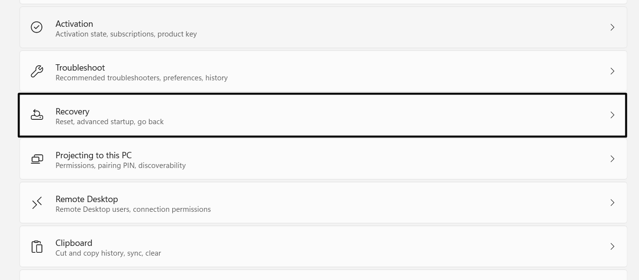 1.Ir alRecuperaciónsección de su PCAplicación de configuracióny pasar a laOpciones de recuperaciónsección.