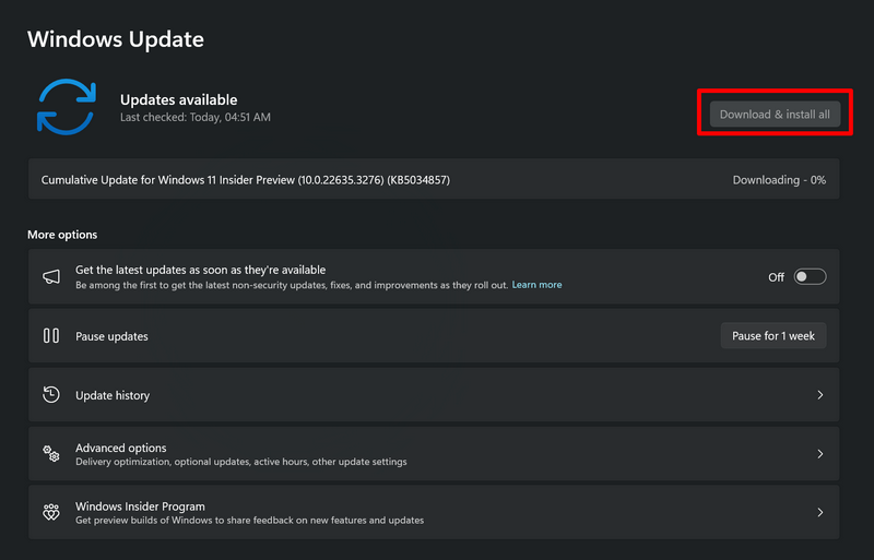4.Una vez que las actualizaciones estén disponibles,deberían comenzar a descargarse automáticamente. En caso de que no sea así, haga clic en elDescargar e instalar todos los botonespara iniciar el proceso.