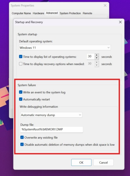 Además de las aplicaciones y servicios de terceros, el error “Error al crear el archivo de volcado debido a un error durante la creación del volcado” también puede surgir debido a configuraciones de depuración mal configuradas en su PC o computadora portátil con Windows 11. En este caso, debe abrir el menú de configuración avanzada del sistema y configurar correctamente los ajustes de depuración desde allí.