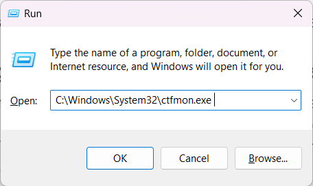 2.En elCorrercaja, tipoC:WindowsSystem32ctfmon.exey luego presione el botónIntroducir clave.