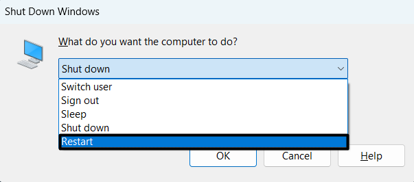 2.DesdeFuerzamenú, elija elReanudaropción para reiniciar su PC con Windows 11 ahora.