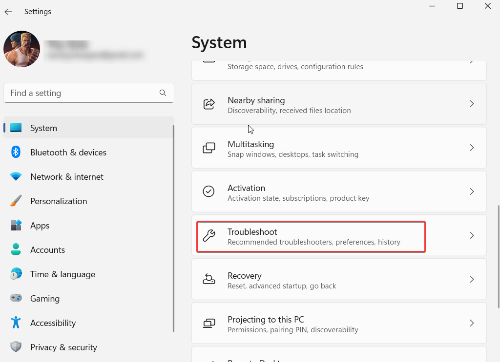 Paso 2 –Hacer clic enSistemadesde el lado izquierdo, si aún no está seleccionado. Desplácese hacia abajo y haga clic enSolucionar problemasdesde la derecha.