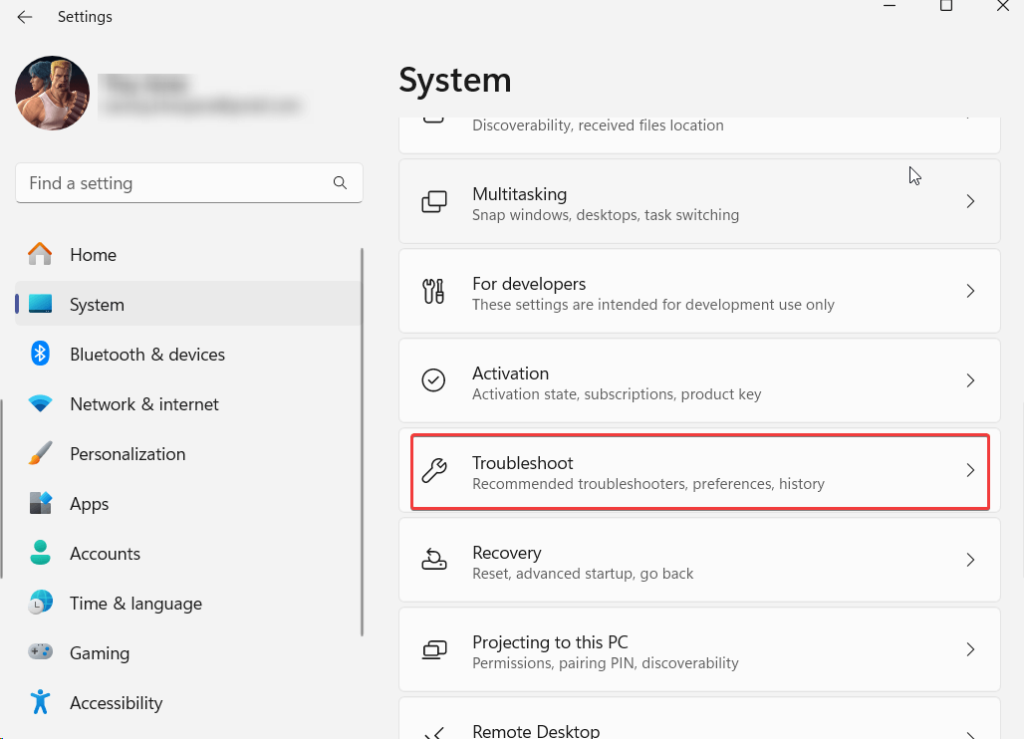 Paso 2 –Hacer clic enSistemasi aún no está abierto de forma predeterminada. Desde la derecha, desplácese hacia abajo y haga clic enSolucionar problemas.