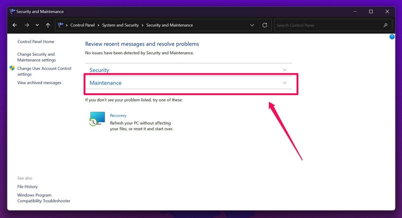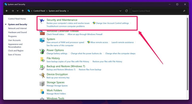 3.A continuación, haga clic enSeguridad y Mantenimientoajustes.