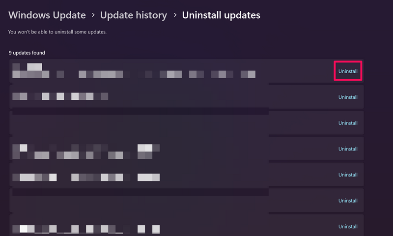 4.llocalizar la actualización de Windows 11 22H2en la lista y haga clic enBotón de desinstalaciónal lado de él.