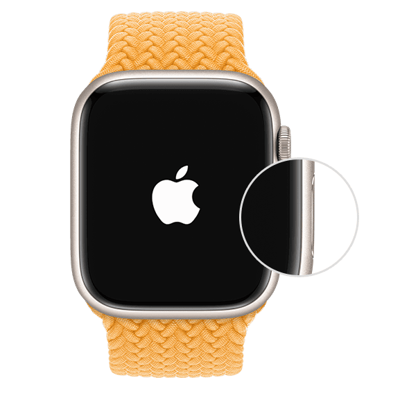 1.Enciende tu Apple Watch si está apagado manteniendo presionado el botón lateral. Suelta el botón una vez que aparezca el logotipo de Apple en la esfera de tu reloj.