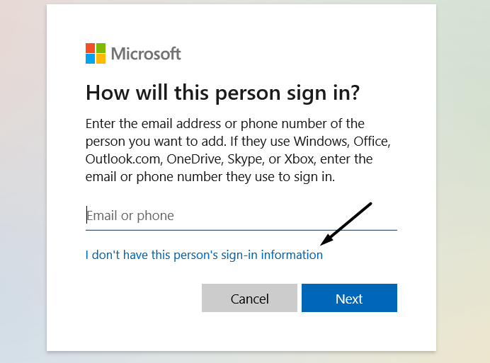 3.En el¿Cómo iniciará sesión esta persona?mensaje, haga clicNo tengo la información de inicio de sesión de esta persona.