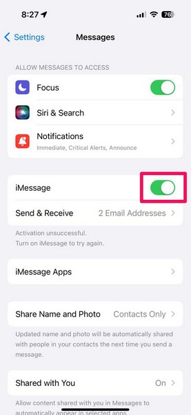 Entonces, si iMessage no está activado en tu iPhone, naturalmente las notificaciones de iMessage no funcionarán. Aunque el servicio está habilitado de forma predeterminada, a veces puede deshabilitarse automáticamente, especialmente después de una actualización o si instala actualizaciones beta de iOS.