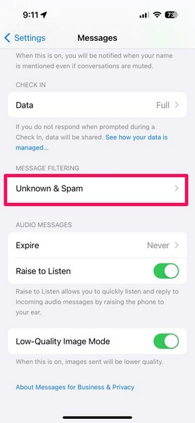 8.Asegúrese de que Filtrar remitentes desconocidos esté desactivado en su iPhone