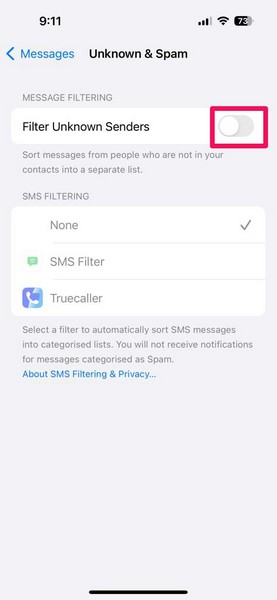 Ahora, si recibió mensajes de texto importantes de iMessage de remitentes desconocidos en su iPhone con la opción Filtrar remitentes desconocidos habilitada, es posible que no reciba alertas sobre ellos. En este caso, debe asegurarse de que la opción Filtrar remitentes desconocidos esté desactivada en su iPhone.