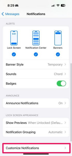 9.Por último, toque elPersonalizar notificaciónopción en la parte inferior.