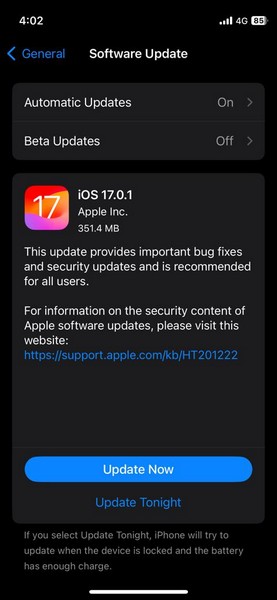 Nota:Asegúrese de que su iPhone esté conectado a una red de Internet activa, tenga suficiente duración de batería (más del 80%) y también tenga suficiente almacenamiento para descargar la actualización. La actualización puede ser de gran tamaño, en caso de que actualice su dispositivo después de mucho tiempo.